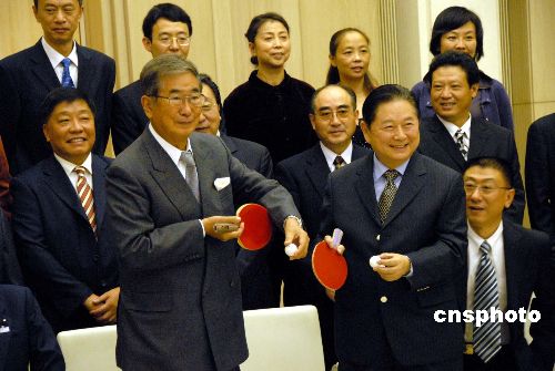10月26日下午,東京都知事石原慎太郎在東京市政大廈會見正在日本訪問的中國乒協(xié)主席徐寅生及其訪日團(tuán)一行20人。徐寅生一行應(yīng)日本乒協(xié)的邀請10月25日抵達(dá)東京開始對日本進(jìn)行一周訪問,代表團(tuán)成員包括莊則棟、曹燕華等10多名國手。石原慎太郎說,在日中邦交正常化35周年之際,在東京見到中國的著名乒乓選手非常榮幸。石原希望中國支持東京申辦2016年夏季奧運(yùn)會,通過體育交流促進(jìn)中日關(guān)系。中新社發(fā) 段躍中 攝