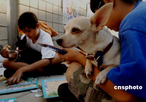美國南加州二十三處火場十月二十九日控制得只剩七處,集中在圣地牙哥和橙縣,失去家園的小災(zāi)民和寵物在收容中心相依為命。中新社發(fā) 賈國榮 攝