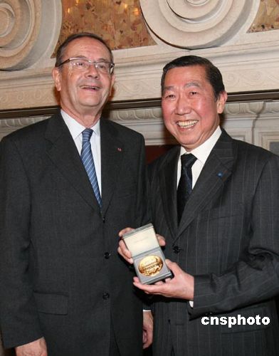 當(dāng)?shù)貢r(shí)間1月7日,法國納伊市市長巴依向旅法僑界知名華裔人士何福基(右)頒授榮譽(yù)獎(jiǎng)?wù),以表彰他為促進(jìn)法中友好與合作及亞裔融入法國社會(huì)做出的積極貢獻(xiàn)。與法國總統(tǒng)薩科奇相識三十多年的何福基,是該市的一位知名人士,2007年底薩科奇首次訪華時(shí),何;鳛榇韴F(tuán)中唯一的華裔人士隨同訪問。中新社發(fā) 鐘誠 攝