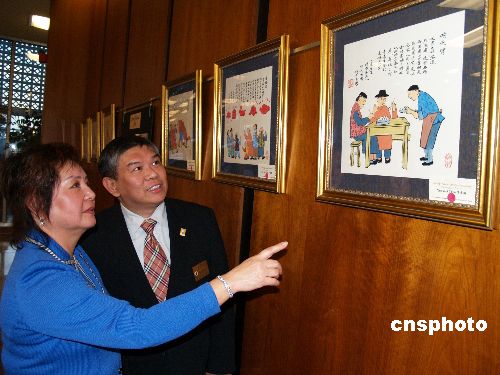 2008年1月9日,華人聚集的洛杉磯阿罕伯拉市舉行中國(guó)年畫(huà)拍賣(mài)會(huì),為阿罕伯拉市高中籌集教育基金。成都女畫(huà)家陳雪梅的12幅鼠年年畫(huà),為美國(guó)中學(xué)生籌得近5000美金。阿罕伯拉市華裔市長(zhǎng)沈時(shí)康、拍賣(mài)活動(dòng)負(fù)責(zé)人陳惠萍欣賞中國(guó)年畫(huà)。中新社發(fā) 盧威 攝