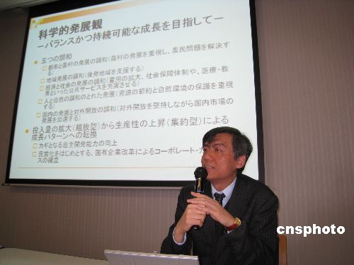 1月19日,由早稻田大學中國塾(研究會)主辦的2008年新春演講會,在早稻田大學國際會議中心舉行,百余人與會。旅日華人學者、知名中國經(jīng)濟專家關(guān)志雄博士進行演講。圖為關(guān)志雄在介紹中國的科學發(fā)展觀。中新社發(fā) 段躍中 攝