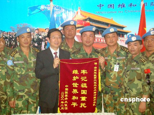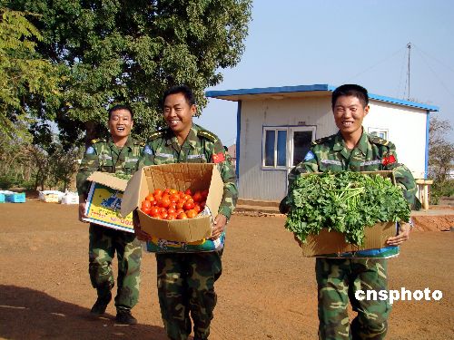 當(dāng)?shù)貢r間2月3日下午,中國駐蘇丹大使李成文在董建東武官的陪同下,帶領(lǐng)中國石油天然氣集團(tuán)公司代表一行5人乘專機(jī)前往蘇丹南部城市瓦烏,慰問中國駐蘇丹維和工兵、運(yùn)輸、醫(yī)療分隊。李大使代表中國駐蘇丹大使館向維和部隊贈送一面鑲有“牢記祖國重托、維護(hù)世界和平”字樣的錦旗及慰問品。隨同的中國石油天然氣集團(tuán)公司代表向維和部隊贈送1000余公斤新鮮蔬菜。中新社發(fā) 劉恩海 攝