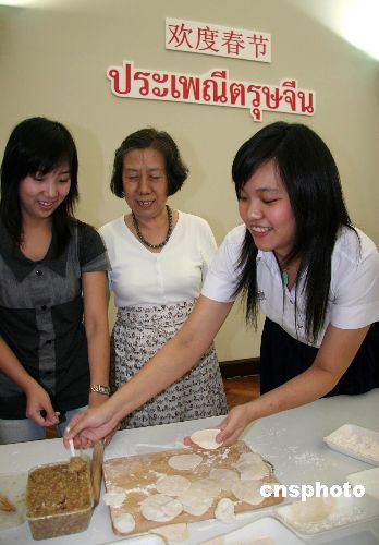 圖為朱拉隆功大學孔子學院中方院長、北京大學教授傅增有(左),在教泰國學生包餃子。