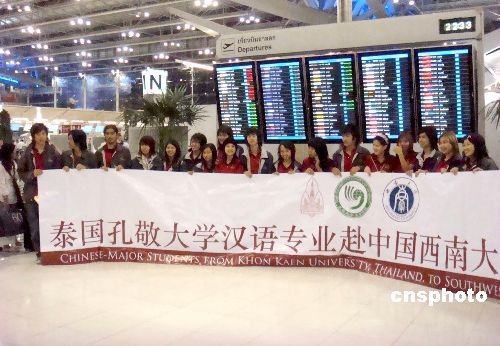 來(lái)自泰國(guó)孔敬大學(xué)孔子學(xué)院的五十七名泰籍本科生帶著家長(zhǎng)與老師的諄諄教誨五日飛往重慶中國(guó)西南大學(xué),開(kāi)始他們?cè)谥袊?guó)為期兩年的學(xué)習(xí)生活,這標(biāo)志著泰國(guó)孔敬大學(xué)孔子學(xué)院與中國(guó)西南大學(xué)的“一加二加一漢語(yǔ)本科”合作項(xiàng)目正式啟動(dòng)?拙创髮W(xué)孔子學(xué)院院長(zhǎng)黃小明說(shuō),今天飛抵重慶的學(xué)生是兩校合作項(xiàng)目“一加二加一漢語(yǔ)本科”招收的第一批學(xué)生,本意是第一、第四年在泰國(guó),第二、第三年在中國(guó)學(xué)習(xí),畢業(yè)時(shí)學(xué)生們將得到中泰兩校頒發(fā)的畢業(yè)證書(shū)。中新社發(fā) 顧時(shí)宏 攝