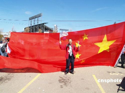 當(dāng)?shù)貢r(shí)間4月9日,在歡迎北京奧運(yùn)圣火傳遞舊金山的隊(duì)伍中,美國(guó)清華大學(xué)校友會(huì)打出的5米長(zhǎng)的巨幅五星紅旗耀眼奪目。作者: 盧威