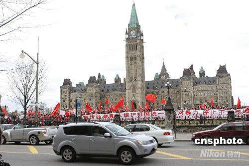 當(dāng)?shù)貢r(shí)間4月13日下午,近萬(wàn)名來(lái)自加拿大各地的華人聚集在首都渥太華國(guó)會(huì)山廣場(chǎng),舉行“宣傳西藏真相,維護(hù)祖國(guó)統(tǒng)一”大型集會(huì)活動(dòng)。集會(huì)全程充滿“和平、友愛”的熱烈氣氛,組織者宣讀了中英文集會(huì)聲明和致加拿大總理哈珀公開信,表達(dá)海外華人“支持一個(gè)中國(guó)、支持北京奧運(yùn)會(huì),反對(duì)暴力”的心愿。中新社發(fā) 捷克佳 攝