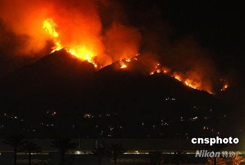 當(dāng)?shù)貢r(shí)間四月二十六日下午,距離洛杉磯市中心東北十幾英里的Sierra Madre發(fā)生山林大火。截至當(dāng)天午夜,大火仍在燃燒,估計(jì)過火面積約一百英畝,目前還沒有人員傷亡的報(bào)告。當(dāng)?shù)叵啦块T稱,起火原因可能與近期的干燥天氣有關(guān)。去年十月,洛杉磯地區(qū)發(fā)生大規(guī)模山林大火,數(shù)千人無家可歸。中新社發(fā) 張煒 攝