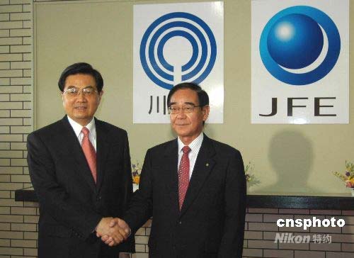 5月9日上午10時(shí)20分,正在日本進(jìn)行國(guó)事訪問(wèn)的中國(guó)國(guó)家主席胡錦濤來(lái)到神奈川縣川崎市的日本JFE工程技術(shù)株式會(huì)社下屬川崎環(huán)保工廠參觀,受到該廠員工們熱烈歡迎。圖為胡錦濤主席與前來(lái)迎接的川崎市市長(zhǎng)阿部孝夫(右)握手留影。中新社發(fā) 關(guān)妍 攝