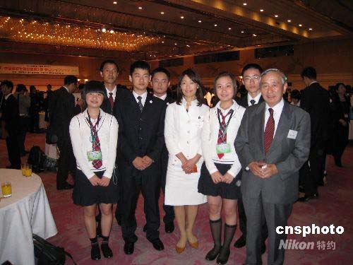 5月14日晚,由日本財(cái)團(tuán)法人日中友好會(huì)館、社團(tuán)法人日中友好協(xié)會(huì)主辦的歡迎中國(guó)高中生400人訪問團(tuán)酒會(huì)在東京舉行。作為2008年“二十一世紀(jì)東亞青少年大交流計(jì)劃”的第二批,他們將參加與日中關(guān)系相關(guān)的研討會(huì),走進(jìn)日本高中課堂,在日本高中學(xué)生家庭住宿外,還將進(jìn)行文化、經(jīng)濟(jì)、社會(huì)等方面的考察。圖為出席酒會(huì)的四川高中生和日中友好會(huì)館谷野作太郎副會(huì)長(zhǎng)合影。中新社發(fā) 段躍中 攝