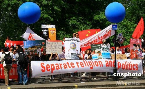 當(dāng)?shù)貢r(shí)間5月22日下午,中國留學(xué)生和華人青年在英國皇家阿爾伯特廳外舉行示威,抗議達(dá)賴?yán)锿崆鞑卣嫦,呼吁西方民眾要了解真?shí)的西藏。中新社發(fā) 李鵬 攝
