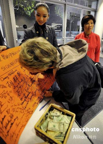 當(dāng)?shù)貢r間五月二十二日晚間,第五屆舊金山國際藝術(shù)節(jié)在舊金山芳草地藝術(shù)中心開幕。原中央芭蕾舞首席演員侯宏瀾和美國舞者瓊斯擔(dān)綱的芭蕾舞劇《傾城之戀》作為首演節(jié)目登場。家在成都的侯宏瀾心系正在抗震救災(zāi)的家鄉(xiāng)父老,在劇場門口樹起一塊橙色紙板,用中英文寫著“請幫助中國四川受災(zāi)的人們”,F(xiàn)場觀眾競相簽名捐款。中新社發(fā) 陳鋼 攝