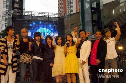 5月25日傍晚,中日兩國著名歌手齊聚東京六本木新城為四川地震災(zāi)區(qū)舉行露天賑災(zāi)演唱會(huì)。圖為演唱會(huì)前,參加演出的全體歌手陳美齡、斯琴格日勒、孫國慶等一起帶領(lǐng)全場觀眾為四川加油。中新社發(fā) 朱沿華 攝