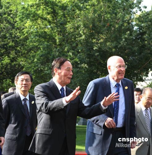 6月18日,第四次中美戰(zhàn)略經(jīng)濟(jì)對(duì)話進(jìn)入第二天。圖為中國副總理王歧山與美國財(cái)長(zhǎng)保爾森在對(duì)話開始前交談。中新社發(fā) 譚宏偉 攝