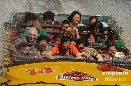 當(dāng)?shù)貢r間六月十八日,來自北京的旅游團(tuán)成員在好萊塢“侏羅紀(jì)公園”享受驚險刺激。該旅游團(tuán)于十七日晚抵達(dá)洛杉磯,他們是美國向中國旅游團(tuán)正式開放后抵達(dá)洛杉磯的首批中國內(nèi)地游客,共有七十多人,以中老年人為主。他們將在美國東西海岸主要旅游城市停留十二天至十三天,每位游客的團(tuán)費(fèi)約兩萬元人民幣。中新社發(fā) 張煒 攝