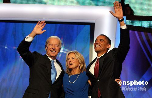 當(dāng)?shù)貢r(shí)間8月27日,美國(guó)民主黨全國(guó)代表大會(huì)正式提名伊利諾伊國(guó)會(huì)參議員奧巴馬和特拉華州國(guó)會(huì)參議員拜登為總統(tǒng)、副總統(tǒng)候選人。中新社發(fā) 李靜 攝