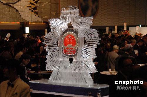 9月26日晚,中國(guó)駐日大使崔天凱在東京新大谷飯店舉行盛大的國(guó)慶招待會(huì),與日本各界人士、在日華僑華人代表共慶中華人民共和國(guó)成立五十九周年,一千五百余人應(yīng)邀出席。會(huì)場(chǎng)入口處,一座大型中國(guó)國(guó)徽冰雕引人注目。據(jù)介紹,這是新大谷飯店為祝賀中國(guó)國(guó)慶特別制作的。中新社發(fā) 段躍中 攝