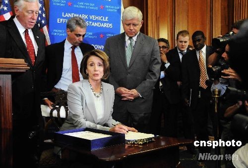 圖為眾議長南!づ迓逦鳎ㄗ撸┰趪鴷渌I袖的陪同下簽署了這個剛剛通過的方案。