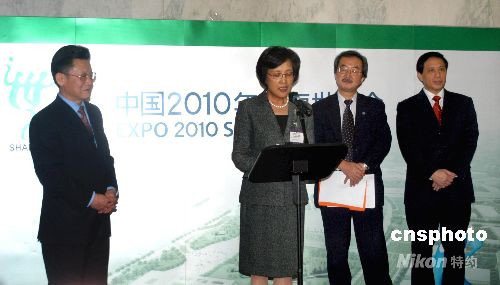 當地時間十月六日,“上海世博會聯(lián)合國圖片展”在紐約聯(lián)合國總部開幕。上海世博會執(zhí)委員常務副主任鐘燕群(中)介紹上海世博會籌備情況。聯(lián)合國副秘書長沙祖康(左)、副秘書長赤阪清隆(右二)和中國常駐聯(lián)合國代表張業(yè)遂出席開幕式(右)。該圖片展由上海世博會事務協(xié)調局、中國常駐聯(lián)合國代表團和上海市對外文化交流協(xié)會共同舉辦。中新社發(fā) 汪晨 攝