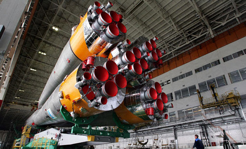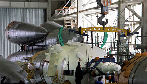 10月9日,在哈薩克斯坦的拜科努爾航天基地,俄羅斯專家在組裝“聯(lián)盟TMA-13”載人飛船的逃生系統(tǒng)。