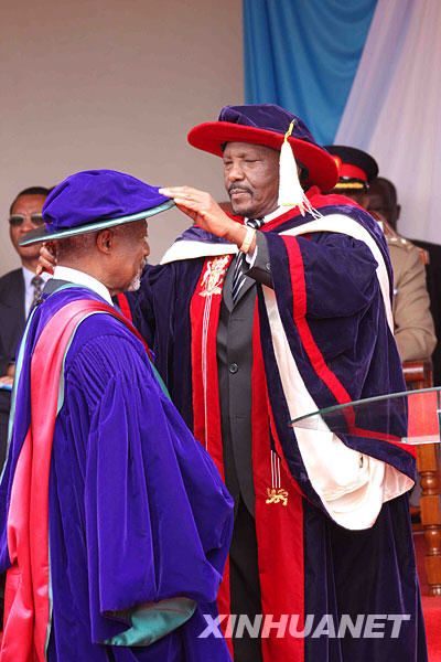 10月17日,在肯尼亞首都內(nèi)羅畢,內(nèi)羅畢大學(xué)校長約瑟夫·旺朱伊(右)為聯(lián)合國前秘書長科菲·安南(左)戴上博士帽。新華社發(fā)(湯姆·尼亞莫基攝)