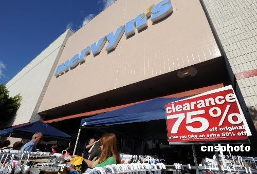 十月十八日,洛杉磯附近一家Mervyns百貨店打出削價(jià)百分之七十五清貨的告示,消費(fèi)者正在選購清貨甩賣的服裝。擁有五十九年歷史的美國(guó)老牌連鎖百貨公司Mervyns剛剛成為美國(guó)經(jīng)濟(jì)滑坡的新犧牲品。這家已經(jīng)申請(qǐng)破產(chǎn)保護(hù)的百貨公司周五宣布,旗下一百四十九家商店進(jìn)行清貨銷售,然后關(guān)門停業(yè)。美國(guó)金融危機(jī)已經(jīng)蔓延到實(shí)體經(jīng)濟(jì),十月份美國(guó)消費(fèi)信心指數(shù)創(chuàng)下三十年來最大月度跌幅。中新社發(fā) 張煒 攝