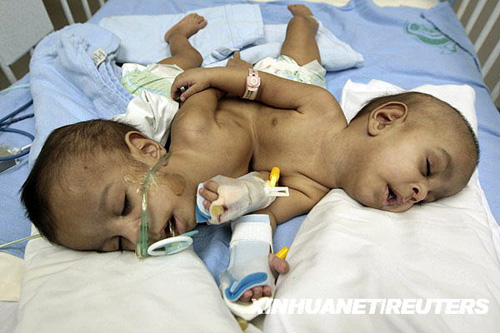 10月22日,在沙特阿拉伯首都利雅得的一家醫(yī)院,伊拉克連體男嬰齊亞德和伊亞德在熟睡中。新華社/路透
