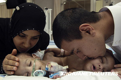 在沙特阿拉伯首都利雅得的一家醫(yī)院,伊拉克連體男嬰齊亞德和伊亞德的父母在親吻熟睡中的孩子。這對四個月大的連體男嬰將于25日迎來分離手術(shù)。新華社/路透