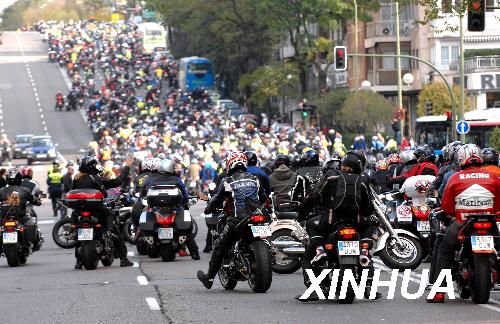 11月8日,眾多摩托車手在西班牙首都馬德里市中心街道參加大游行。當(dāng)日,來自西班牙各地的上萬(wàn)名摩托車手在首都馬德里參加大游行,呼吁政府部門改善道路交通條件,保障摩托車出行安全。據(jù)統(tǒng)計(jì),西班牙2007年共有500余名摩托車手在交通事故中喪生。新華社記者陳海通攝