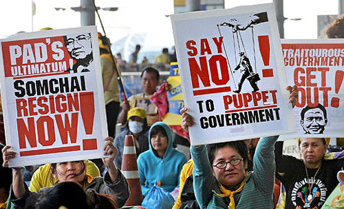 11月28日,泰國反政府的人民民主聯(lián)盟(民盟)支持者在曼谷素萬那普國際機(jī)場內(nèi)繼續(xù)抗議。泰國總理頌猜27日晚在泰國北部城市清邁發(fā)表全國電視講話,宣布在曼谷素萬那普國際機(jī)場和廊曼機(jī)場實(shí)施緊急狀態(tài)法。但是民盟支持者依舊占領(lǐng)著這兩個(gè)機(jī)場。