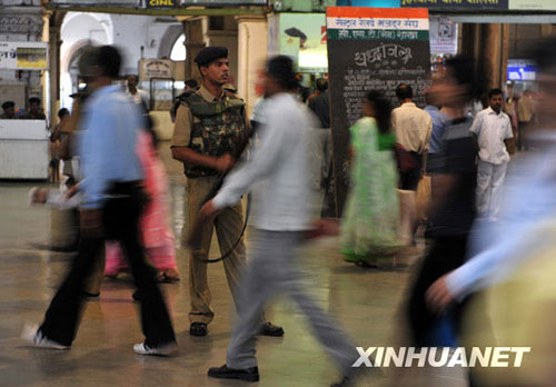 印度警察在CST火車站內(nèi)駐守。