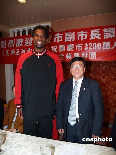 當(dāng)?shù)貢r(shí)間12月6日,重慶市副市長譚棲偉率重慶市政府代表團(tuán)飛抵美國洛杉磯,受到洛杉磯僑界的熱烈歡迎,美國職業(yè)藍(lán)球NBA球星格林也趕來迎接中國客人,并與譚棲偉副市長合影留念。中新社發(fā) 盧威 攝