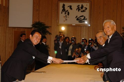12月8日下午,日本首相麻生太郎在位于東京的首相官邸會見了新一屆中日友好21世紀(jì)委員會的中日兩國委員并接受了該委員會提交的最終工作報告。圖為中方首席委員鄭必堅和日方首席委員小林陽太郎共同向麻生首相提交工作報告。中新社發(fā) 朱沿華 攝