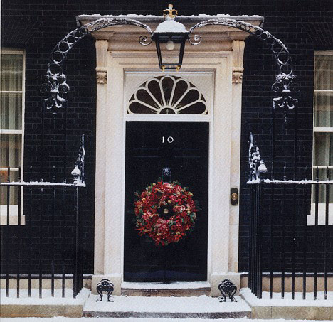 唐寧街10號(hào)的漂亮前門、臺(tái)階以及欄桿上的灰塵非常干燥,表明那些雪花應(yīng)該是假的。