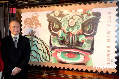 美國郵政總局8日正式發(fā)行“牛年”郵票,以慶祝世界約四分之一人口正期盼的農(nóng)歷新年“牛年”到來。圖為郵票設(shè)計者、現(xiàn)居紐約的華裔郵票藝術(shù)家麥錦鴻(Kam Mak)和“牛年”郵票。中新社發(fā) 魏晞 攝