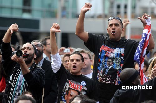 當(dāng)?shù)貢r(shí)間一月二十日清晨,兩千多名洛杉磯市民聚集在洛杉磯動(dòng)感廣場(chǎng)(LA LIVE),通過大屏幕觀看美國(guó)第四十四任總統(tǒng)奧巴馬就職儀式。當(dāng)電視畫面出現(xiàn)卸任總統(tǒng)布什時(shí),人群中發(fā)出噓聲,一些奧巴馬支持者向布什表達(dá)不滿。