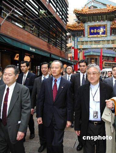 2009年1月23日上午,中國駐日本國特命全權(quán)大使崔天凱冒雨前往橫濱中華街,向當(dāng)?shù)厝A人華僑拜年。崔天凱與橫濱華僑總會會長任政光親切會談,慰問熱心資助教育的愛國華僑吳桂顯先生的遺孀,在臺灣同胞茶店品茶論道等,親身體驗當(dāng)?shù)厝A人生活。崔天凱還視察了橫濱中華街關(guān)帝廟、媽祖廟等建筑,并出席華僑主辦的歡迎午宴。中新社發(fā) 侯宇 攝