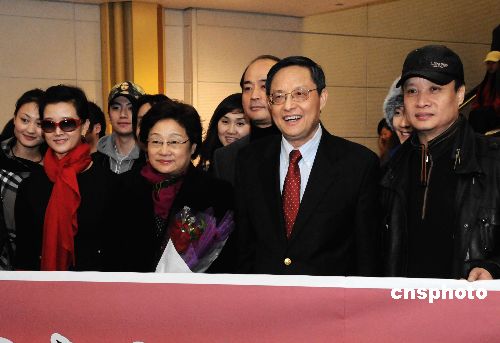 國務院僑辦主任李海峰率領的“文化中國·四海同春”藝術(shù)團今天(2月3日)下午抵達華盛頓,著名歌唱家宋祖英、閻維文等藝術(shù)家同機抵達,受到當?shù)厝A僑華人的熱烈歡迎。圖為中國駐美大使周文重率中國駐美大使館官員到機場迎接李海峰及明星們。中新社發(fā) 邱江波 攝