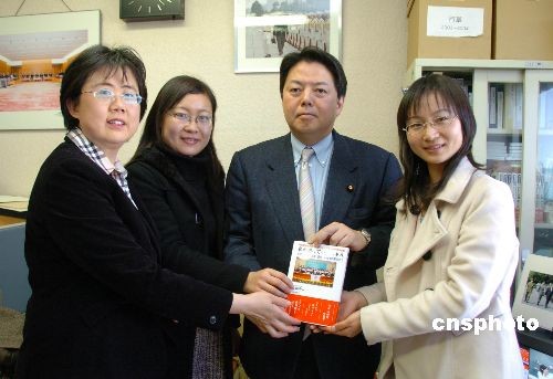 2月6日,日本前防衛(wèi)大臣、日中友好議員聯(lián)盟秘書長、參議院議員林芳正,在他的事務(wù)所接見了第四屆中國人日語征文大賽主辦單位代表日本僑報社社長張景子和兩名最優(yōu)秀獎(日本大使獎)獲獎?wù)摺本┐髮W(xué)研究生徐蓓和湘潭大學(xué)青年教師張桐赫。林芳正勉勵獲獎?wù)吆退袇①愓呃^續(xù)努力,為日中交流作出更大貢獻。圖為林芳正與徐蓓、張桐赫及主辦單位代表合影。中新社發(fā) 段躍中 攝