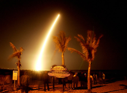中新網(wǎng)3月7日電 美國東部時(shí)間6日22時(shí)50分,世界首個(gè)用于探測太陽系外類地行星的“開普勒”號太空望遠(yuǎn)鏡在美國卡納維拉爾角空軍基地發(fā)射升空。圖為群眾正在觀看“開普勒”號升空的盛況。