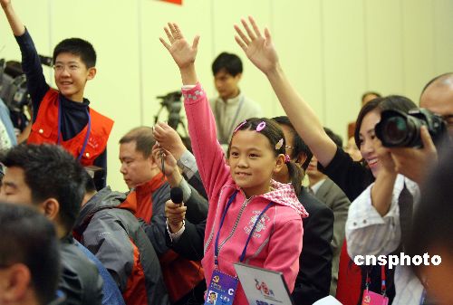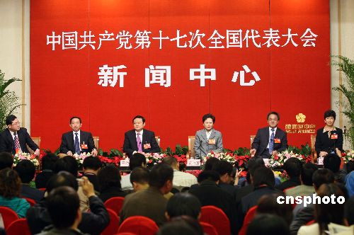 十月二十日晚,出席中共十七大的國家文化部副部長于幼軍、教育部副部長袁貴仁、全國婦聯(lián)副主席黃晴宜、共青團(tuán)中央書記處第一書記胡春華、國家廣播電影電視總局副局長趙實(shí)等代表就未成年人教育問題,在北京梅地亞中心接受中外媒體采訪。中新社發(fā) 毛建軍 攝