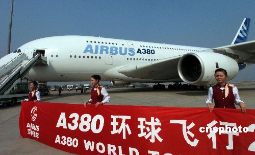 空中客車A380飛機(jī)環(huán)球飛行之旅,十月二十三日抵達(dá)廣州,拉開了為期一周的中國大陸演示飛行的序幕。A380將在中國大陸的廣州、上海、北京三地進(jìn)行體驗(yàn)飛行和靜態(tài)演示。中新社發(fā) 柯小軍 攝