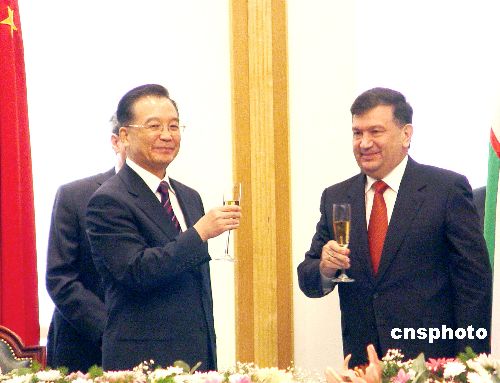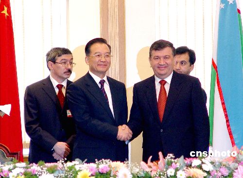 十一月三日,中國總理溫家寶在塔什干同烏茲別克斯坦總理米爾濟亞耶夫舉行會談,會談結(jié)束后,兩國總理出席了兩國政府經(jīng)濟技術(shù)合作協(xié)定等合作文件的簽字儀式。雙方還發(fā)表了兩國政府聯(lián)合公報。中新社發(fā) 孫宇挺 攝