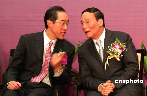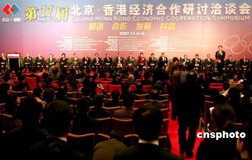11月5日,第11屆北京·香港經(jīng)濟(jì)合作研討洽談會(huì)在北京舉行。北京市市長(zhǎng)王岐山與香港政務(wù)司司長(zhǎng)唐英年出席開幕式。中新社發(fā) 張宇 攝