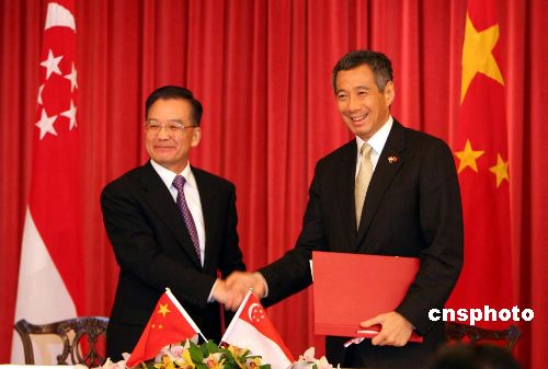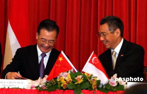 到訪的中國國務(wù)院總理溫家寶十一月十八日在新加坡總統(tǒng)府與新加坡總理李顯龍共同簽署了兩國合作建設(shè)中新天津生態(tài)城框架協(xié)議。“生態(tài)城”項目的地點選定在中國天津。中新社發(fā) 周群 攝