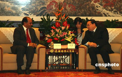 11月28日晚間,湖南省委副書記梅克保(右)在長沙會(huì)見以“法塔赫”中央委員、對外關(guān)系部部長阿卜杜拉·伊弗朗吉為團(tuán)長的巴勒斯坦民族解放運(yùn)動(dòng)高級干部考察團(tuán)一行。會(huì)見中,阿卜杜拉·伊弗朗吉表示,湖南雜交水稻的先進(jìn)技術(shù)和成果讓我感到驕傲和安心,這樣中國及世界其他國家的糧食安全問題就有保障了。應(yīng)中聯(lián)部邀請,阿卜杜拉·伊弗朗吉一行十人近日訪華,十一月二十五日至二十九日在湘期間,他們考察湖南經(jīng)濟(jì)建設(shè)、基層黨建、黨員培訓(xùn)和新農(nóng)村建設(shè)等情況,并參觀韶山、省委黨校、雜交水稻研究中心。中新社發(fā) 肖前輝 攝