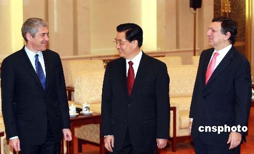 十一月二十八日,北京人民大會堂,中國國家主席胡錦濤會見歐盟輪值主席國葡萄牙總理蘇格拉底與歐盟委員會主席巴羅佐。他們是前來參加第四屆中歐工商峰會的。中新社發(fā) 廖文靜 攝