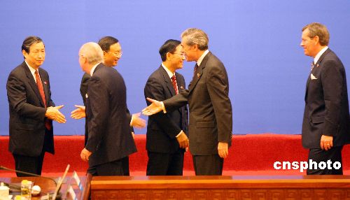 十二月十二日,第三次中美戰(zhàn)略經(jīng)濟對話在北京中信國安第一城開幕。出席會議的中方代表謝旭人(財政部長)、楊潔篪(外交部長)、馬凱(國家發(fā)改委主任)等(從右至左),與美方代表雷德(美國駐華大使)、古鐵雷斯(商務部長)(從左至右)等握手寒暄。中新社發(fā) 毛建軍 攝