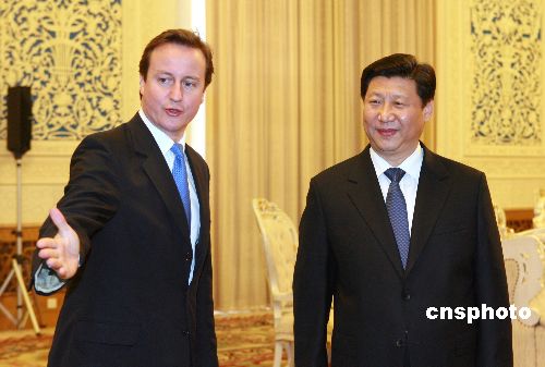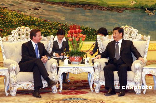 十二月十九日,中共中央政治局常委、書記處書記習(xí)近平在北京人民大會(huì)堂會(huì)見了由英國保守黨領(lǐng)袖戴維·卡梅倫率領(lǐng)的英國保守黨代表團(tuán)。中新社發(fā) 廖文靜 攝