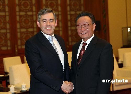 1月18日,中國全國人大常委會委員長吳邦國在北京人民大會堂會見來訪的英國首相布朗。中新社發(fā) 盛佳鵬 攝