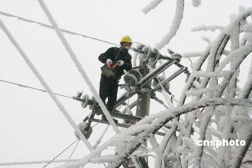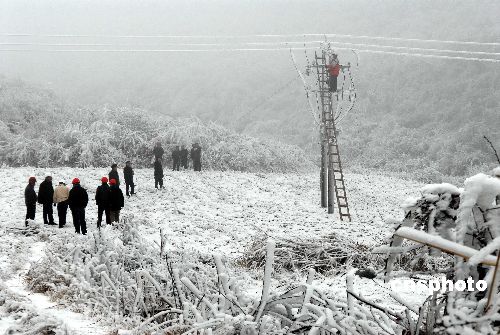 1月20至21日,黔東南州各縣電力職工在搶修受冰凍災(zāi)害的電力設(shè)施。連日來,由于持續(xù)出現(xiàn)大范圍雪凝天氣,貴州省黔東南州境內(nèi)的凱里電網(wǎng)(轄管黔東南州各縣市)遭遇自1984年以來最為嚴(yán)重的冰凍災(zāi)害,凱里電網(wǎng)部門及下屬的15家縣局已緊急采取措施,確保電網(wǎng)穩(wěn)定運(yùn)行。1月14日以來,貴州黔東南地區(qū)溫度均在零下1攝氏度,是24年以來最為嚴(yán)重的一次,出現(xiàn)嚴(yán)重的覆冰。覆冰導(dǎo)致一些輸電設(shè)施桿塔和導(dǎo)地線不堪重負(fù)而倒塔斷線,電網(wǎng)設(shè)施受損嚴(yán)重。截止1月21日,凱里電網(wǎng)出現(xiàn)孤網(wǎng)運(yùn)行,各縣農(nóng)網(wǎng)線路等輸配電線路都不同程度出現(xiàn)倒桿斷線的情況,造成黔東南州南部電網(wǎng)七個(gè)縣全部停電。冰災(zāi)發(fā)生后,凱里電網(wǎng)部門迅速啟動(dòng)“抗冰保電”應(yīng)急預(yù)案,同時(shí)在當(dāng)?shù)孛襟w發(fā)布停電預(yù)警公告,并積極做好醫(yī)院、交通、通訊、礦山等重要客戶的安全用電工作。中新社發(fā) 吳如雄 攝